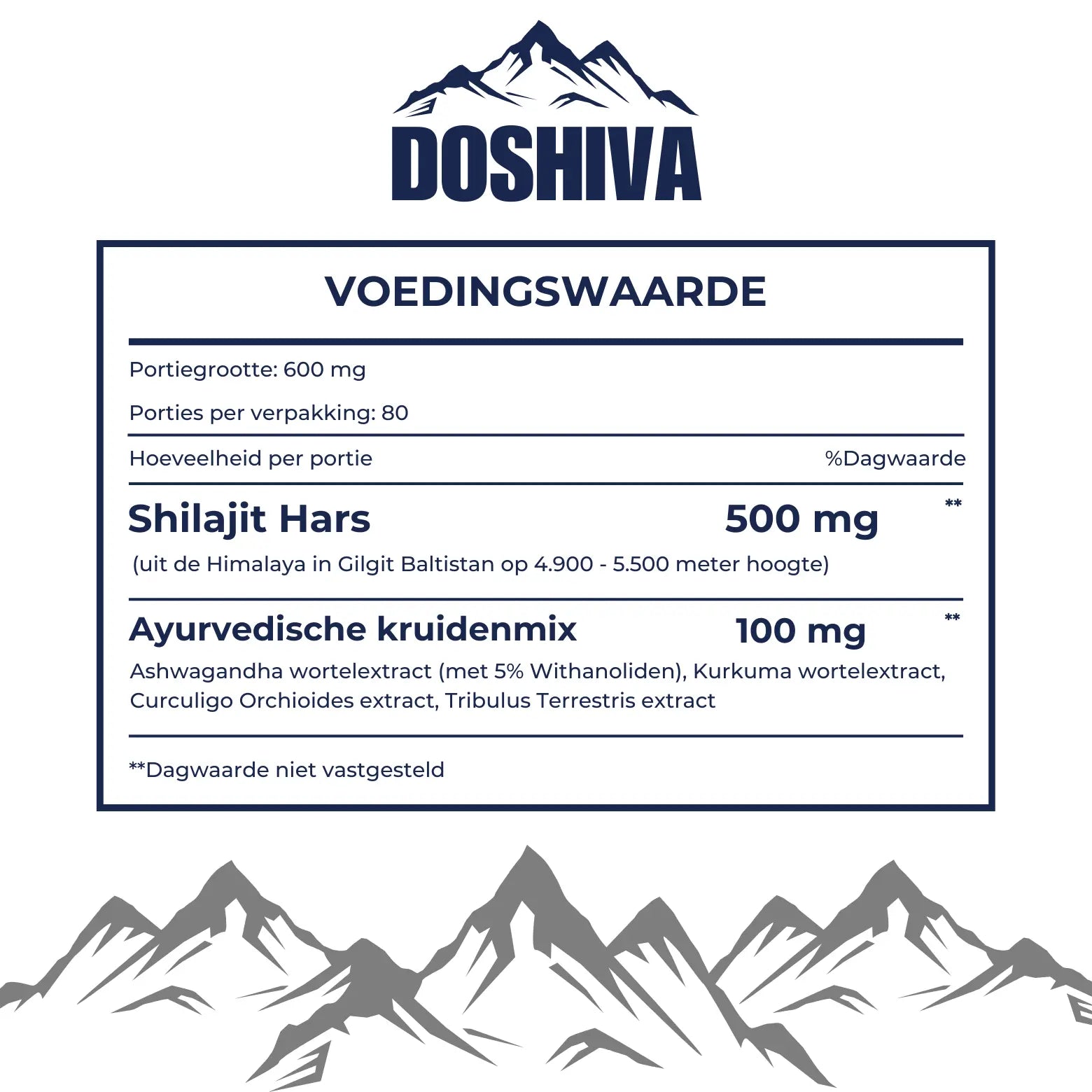 Doshiva combineert 500 mg pure Himalaya Shilajit-Hars met een 100 mg Ayurvedische Kruidenblend, samengesteld voor moderne energie, balans en prestaties.